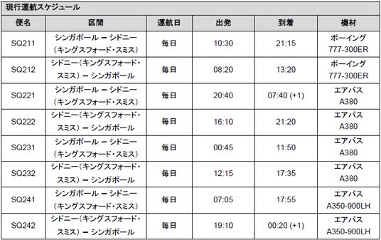 シンガポール航空は、シンガポールとシドニー(キングスフォード・スミス)国際空港間において、引き続き1日4便を運航します。現在のフライトスケジュール*は以下のとおりで、運航時刻は季節により変更となる場合があります。