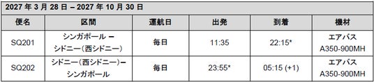 *2027年4月4日から10月2日までの期間は、サマータイム(夏時間)の適用に伴い、SQ201便のシドニー(西シドニー)到着時刻は21時15分、SQ202便のシドニー(西シドニー)出発時刻は22時55分となります。