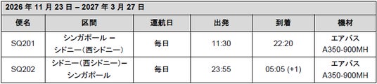 初便となるSQ201便は、シンガポールを2026年11月23日の11時30分(現地時間)に出発し、同日22時20分(現地時間)に西シドニー国際空港に到着する予定です。復路のSQ202便は、同日の23時55分(現地時間)に西シドニー国際空港を出発し、翌11月24日05時05分(現地時間)にシンガポールに到着する予定です。詳細は別添Aをご参照ください。