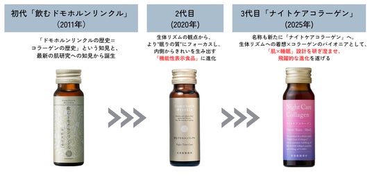 「ナイトケアコラーゲン」の前身、初代「飲むドモホルンリンクル」が誕生したのは、昨今の「睡眠の質」の重要性がブームになるよりずっと前の2011年。日本で初めて*2コラーゲンをスキンケアに配合したブランドとして、「コラーゲンのプロフェッショナル」を自認するドモホルンリンクルの持つ膨大な知見から睡眠と肌の本質的な相関関係に着目し、「肌が育まれる夜に、インナーケアとしてコラーゲンを摂取する」という先駆的な設計のドリンクでした。