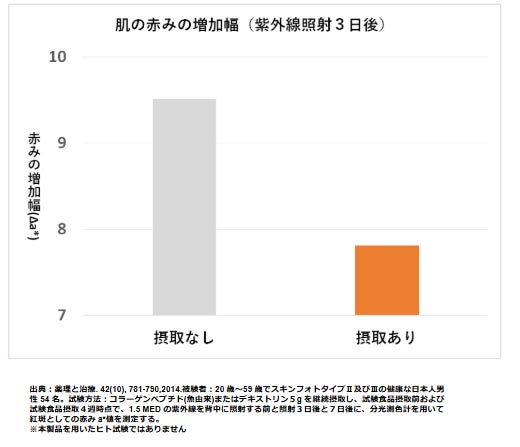 コラーゲン単独の機能で「UVケア」という国内初*1の機能も。*魚由来コラーゲンペプチドの有無による紫外線を浴びた後の赤みを測定したところ、同コラーゲンを1ヵ月(4週)間毎日摂取した場合、紫外線を浴びて3日後の赤みが低いという結果が得られています。
