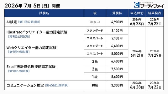 株式会社サーティファイ(本社:東京都中央区、代表取締役:瀧澤茂、以下「サーティファイ」)は、2026年7月5日(日)に開催する「AI検定」「Illustrator(R)クリエイター能力認定試験」「Webクリエイター能力認定試験」「Excel(R)表計算処理技能認定試験」「コミュニケーション検定」の公開試験の申込受付を2026年4月21日より開始しました。