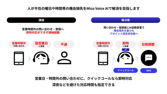 株式会社Mico(本社:大阪市北区、代表取締役社長: 山田 修、以下、当社)は、AI自動架電サービス「Mico Voice AI(ミコボイスAI)に顧客からのWEB問い合わせ時など反応が合った際に、即時にAI架電を行う新機能「クイックコール」を開発、提供を開始したことを発表します。
