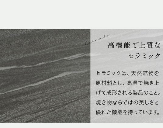 上質な石目調デザインを再現したセラミック天板。マットな質感で指紋や汚れが目立ちにくく頑強なため、見た目だけでなく機能性の観点でも人気の素材です。