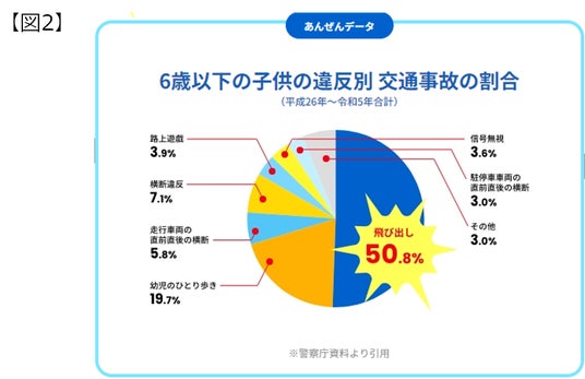 小学校に入学する年齢である7歳は、登下校や放課後の遊びなど、親の手を離れてひとり歩きする機会が増えてきます。そのため、歩行中の交通事故死傷者数が最多の年齢となっています(図1)。中でも、6歳以下の子供の交通事故の原因で最も多いのは「飛び出し事故」であり、全体の約51%が該当します(図2)。トヨタは、7歳を迎える前に交通安全を学んでいただきたいという思いから、全国の幼稚園・保育園の年長児を中心に、交通安全絵本を贈呈する活動や交通安全教室を開催するなど、交通ルールの啓発に努めています。