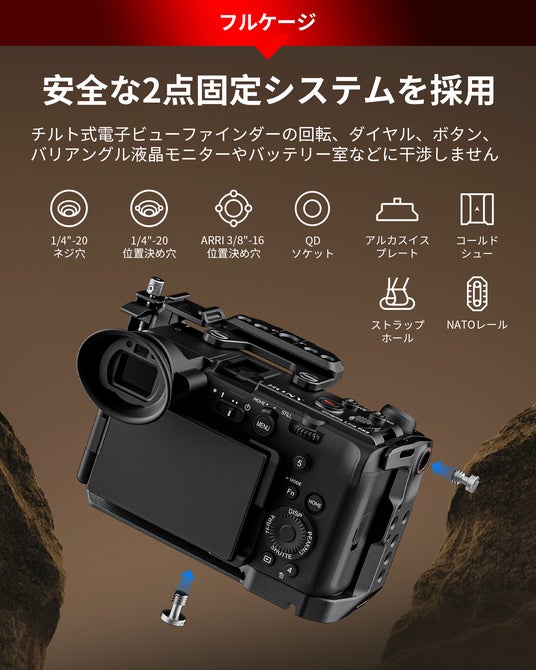 フルケージは2点固定システムを採用しており、安定性を向上させます。チルト式電子ビューファインダーの回転、ダイヤル、ボタン、バリアングル液晶モニターやバッテリー室などに干渉することはありません。