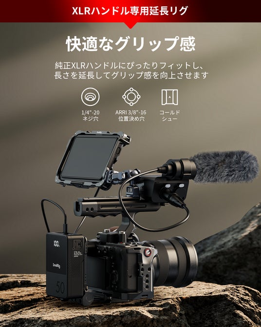 XLRハンドル専用延長リグは純正XLRハンドルにぴったりフィットし、長さを延長することでグリップ感を向上させます。さらに、複数のネジ穴を備えており、アクセサリーを取り付けることが可能です。