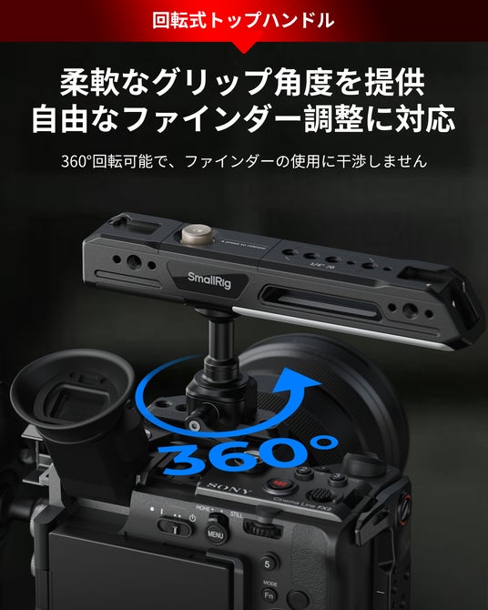 回転式トップハンドルは360度回転可能で、柔軟なグリップ角度を提供するため、ファインダーの使用に干渉することはありません。