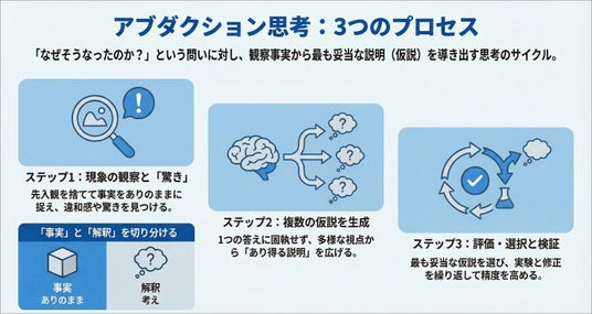 株式会社リスキルは、観察事実から妥当な仮説を導き出す思考法を習得する「アブダクション研修」の提供を開始しました。本研修は、演繹法や帰納法とは異なる推論法であるアブダクションを扱い、ビジネスにおける課題解決の精度向上を目指します。