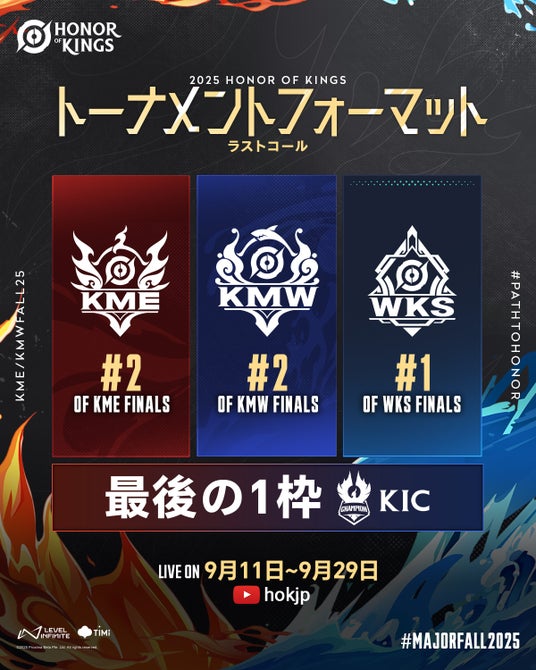 世界に名を馳せるチャンスが提供されるeスポーツ競技の国際試合『Honor of Kings International Championship(KIC)』の出場権をかけて、世界各地から集結したエリート14チームが競い合う「Honor of Kings Major East League(KME)」および「Honor of Kings Major West League(KMW)」が、いよいよ明日9月11日(木)に開幕します。