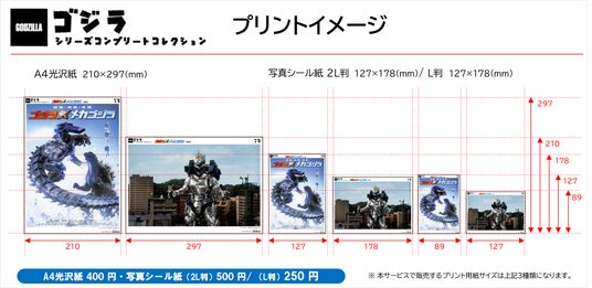 【ゴジラ シリーズ コンプリートコレクション】では、作品の魅力を心行くままに楽しんでいただくための最適サイズとして、保存にも掲出にも最適な厚手用紙の「A4光沢紙」と、写真品質で裏面がシール加工されている「写真シール紙(2L判)」「写真シール紙(L判)」の3種類での販売となります。