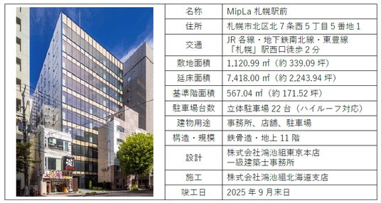 みずほリース株式会社の100%子会社であるエムエル・エステート株式会社(以下「MLE」)は、札幌市内にて新築オフィスビルを取得しましたのでお知らせいたします。MLEのオフィスビルブランド「MipLa(ミプラ)」の物件名称を冠する第4号物件となり、「MipLa札幌駅前」(以下「本物件」)として運用を開始いたします。