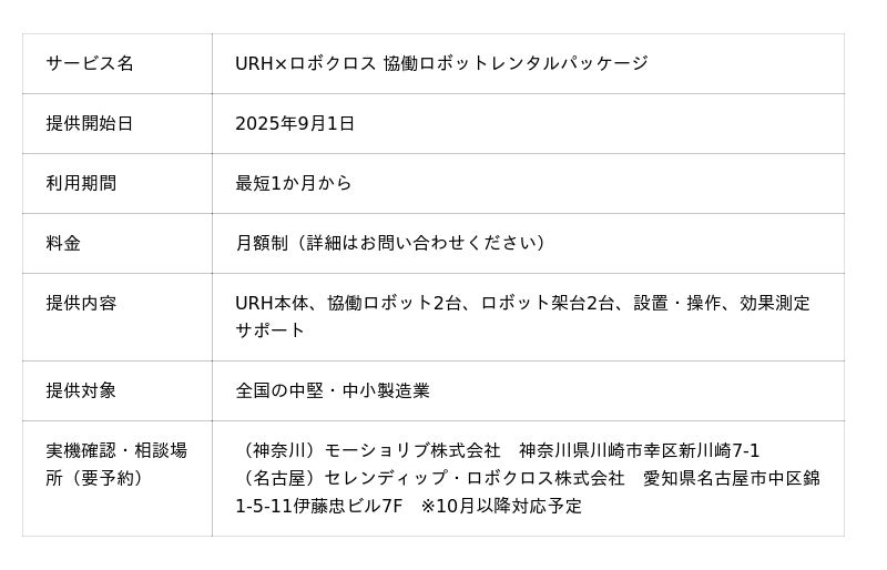 セレンディップ・ホールディンス株式会社(本社:名古屋市中区、代表取締役社長兼CEO 竹内 在)のグループ会社であるセレンディップ・ロボクロス株式会社(本社:名古屋市中区、代表取締役社長 和田正信 以下、セレンディップ・ロボクロス)は、モーションリブ株式会社(本社:神奈川県川崎市、代表取締役社長 溝口貴弘 以下、モーションリブ)と協業し、同社が開発した「力触覚制御」技術搭載の協働ロボット向け遠隔化・自動化ユニット「URH」と、ロボクロスの協働ロボットレンタルソリューション「ロボクロス」を組み合わせたレンタルパッケージサービスを、2025年9月1日より提供開始いたします。