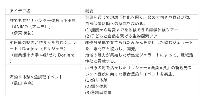 小田原市では、若者が描く夢を実現できる魅力的なまちづくりを進めるため、「令和6年度 おだわら若者応援コンペティション」において、令和6年4月から本市のまちづくりに寄与する若者ならではのアイデアを募集。7月8日~17日までの期間に市民投票、21日に二次審査(プレゼンテーション審査)を実施し、3つのアイデアを採択しました。