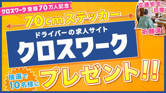 ノンデスク事業者向けの人材採用システム『クロスワーク』を提供するX Mile株式会社(読み:クロスマイル、本社:東京都新宿区、代表取締役:野呂 寛之、以下『当社』)は、会員登録数が累計70万人を突破したことを記念し、「70cm安全祈願ステッカープレゼントキャンペーン」を実施いたします。全国20,000事業所を超える契約事業所をご利用いただいている皆様への感謝を込めて、抽選で10名様に「クロスワーク特製70cm安全祈願ステッカー」をプレゼントいたします。