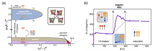 磁気スキルミオンで知られるCu2OSeO3という化合物の磁化過程を東京大学物性研究所の超強磁場発生装置を用いて調べました。飽和磁場直前の未踏の超強磁場領域で、マグノンが凝縮した新しい量子相を発見しました。