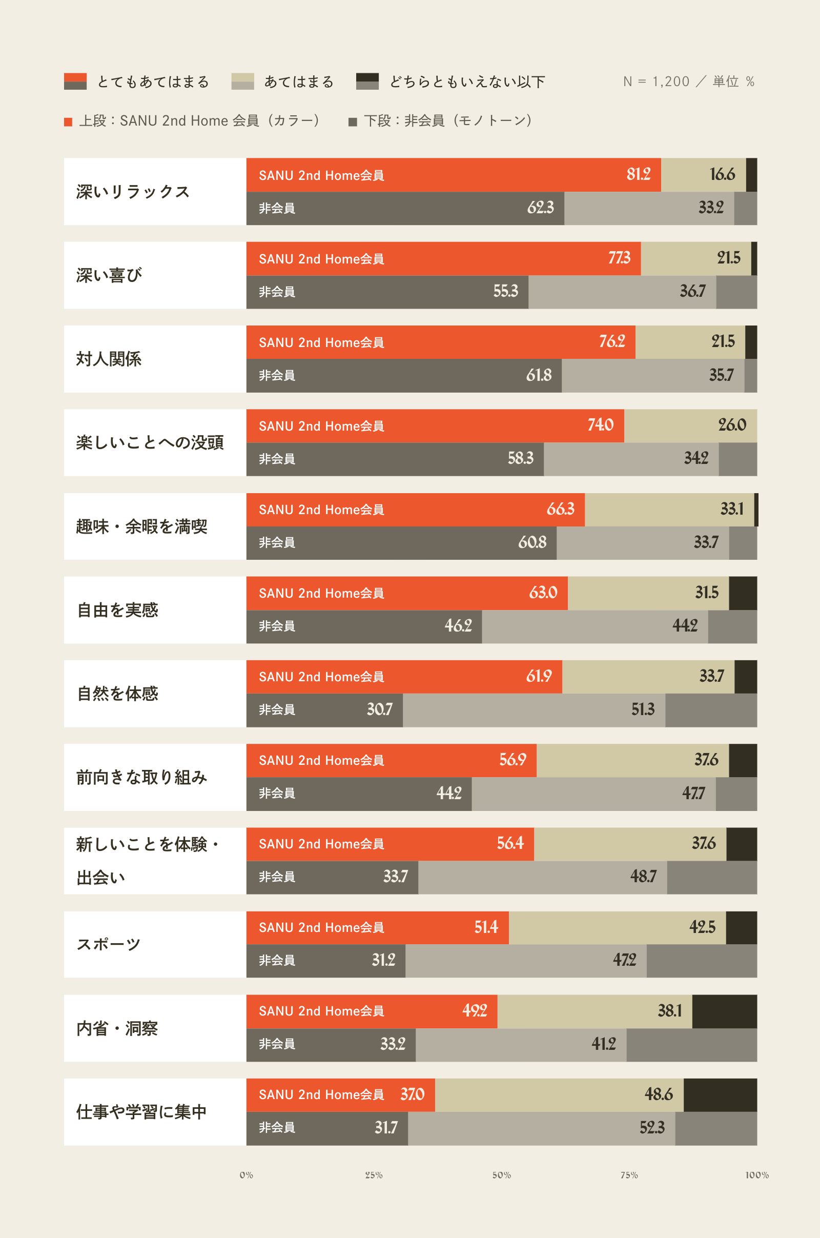 両属性とも“ウェルビーイングに関わる時間”を重視する傾向は共通して確認されましたが、「極めて大切」と回答した割合に着目すると、SANU 2nd Home会員が非会員に比べ、多くの項目で高値を示していることが明らかになりました(図1参照)。特に、「深いリラックス」「深い喜び」「対人関係」「楽しいことへの没頭」「趣味・余暇を満喫」「自由を実感」や「自然の体感」などに関わる項目で、期待水準の高さが確認されました。