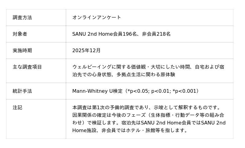 このたび、SANU 2nd Home会員196名・非会員218名を対象とした初期調査の分析結果を公表します。分析により、多拠点生活の実践者は非実践者に比べ ウェルビーイングへの期待水準が高く、自然拠点での滞在においてリラックスや自然体感にとどまらず、集中・内省といった認知的側面でも充足が高まる傾向が示唆されました。なお、本調査は予備的分析であり、因果関係の確定は今後のフェーズ(生体指標・行動データとの組み合わせ)で検証します。