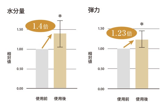 1ヶ月の試験で水分量1.51倍、弾力1.25倍を記録。
