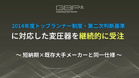 再生可能エネルギー、EV自動車部品、AI及びIoT領域における先進技術を駆使し、グローバルに急速に成長している、~再エネ業界の風雲児~ GBP株式会社(本社:東京、以下GBP)は、トップランナー制度「第二次判断基準(旧基準・2014年基準)」に対応した配電用変圧器の受注を継続しています。多くのメーカーが旧基準品の受注を終了する中、キュービクル向けや既設設備更新などで旧仕様が必要な案件が相次いで停滞し、業界への影響が拡大しています。こうした状況に対し、GBPは同サイズ・同仕様・同等性能の高品質なトランスを安定供給し、最短2か月の納品(※標準仕様・条件適合時の目安です。実際の納期は仕様・検査日程により変動します)を実現することで現場の遅延解消に貢献します。