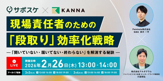 株式会社アルダグラム(本社:東京都港区、代表取締役:長濱光、以下「アルダグラム」)が提供する現場DXサービス「KANNA(カンナ)」は、Paintnote株式会社(本社:品川区、代表者:藤井友輝、以下「Paintnote」)と共催で、2026年2月26日(木)に現場管理にお悩みを抱える現場担当者・責任者の方を対象とした「現場責任者のための「段取り」効率化戦略」をテーマとしたオンラインセミナーを開催します。本セミナーでは、なぜツールを導入しても課題がなくならないのか、その"本当のボトルネック"を、両社の視点から構造的に解説します。