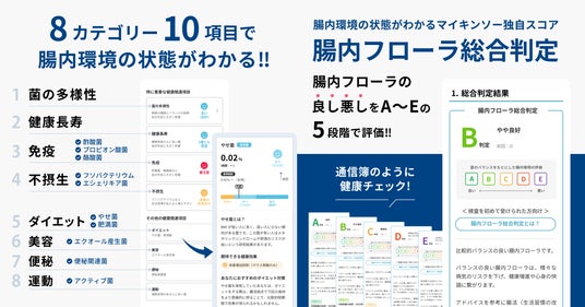 マイキンソーは、自宅で誰でも簡単にできる腸内フローラ(腸内細菌叢)検査サービスです。腸内フローラの良し悪しを5段階で評価する「腸内フローラ総合判定」の搭載に加え、ビフィズス菌や酪酸産生菌、エクオール産生菌などの有用菌、肥満や大腸がんのリスクに関係がある要注意菌など8カテゴリー、10項目が確認できます。加えて、菌の項目に応じた腸内環境を改善するための個別アドバイスもお伝えします。