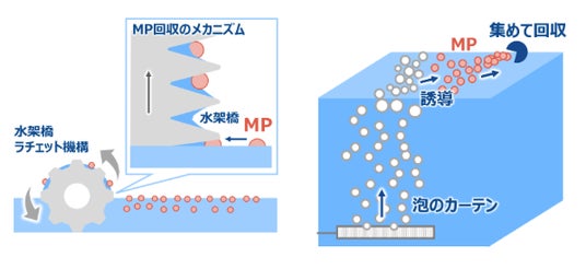 マイクロプラスチックの回収技術.左側:水架橋ラチェット機構、右側:バブルバリア.