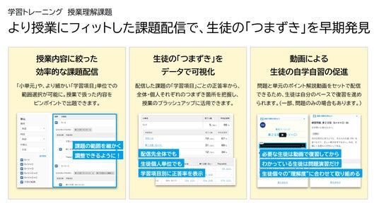 上記によって、先生方の課題作成・回収・確認の手間を削減し、同時に生徒の理解度把握を効率化することで授業内容のブラッシュアップに活用いただくことが可能です。