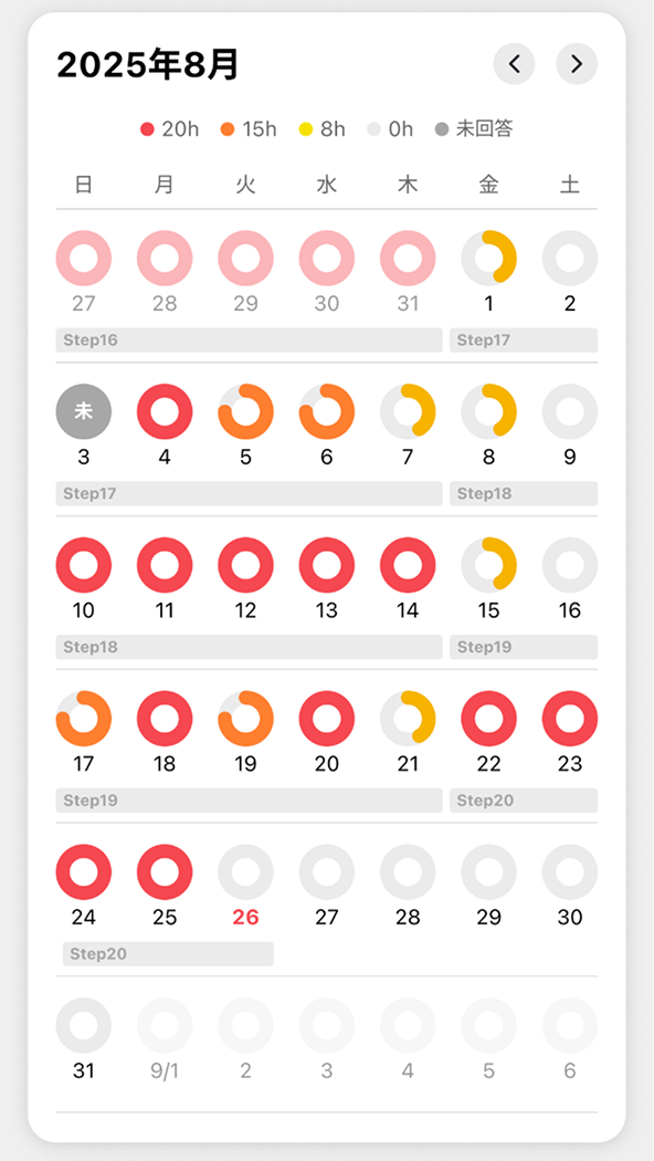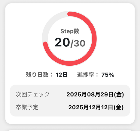 現在のステップが全体の何%まで進んでいるかを数値とグラフで一目で確認できるようになりました。「あとどのくらいで終わるのか」が直感的にわかるため、ゴールに向けたモチベーション維持をサポートします。