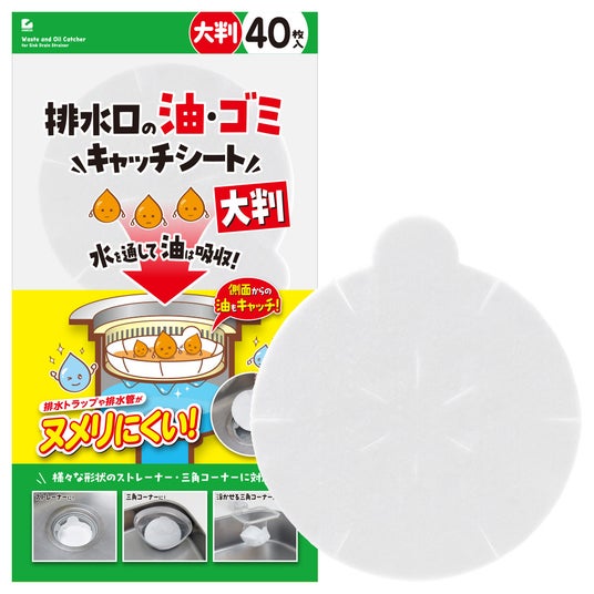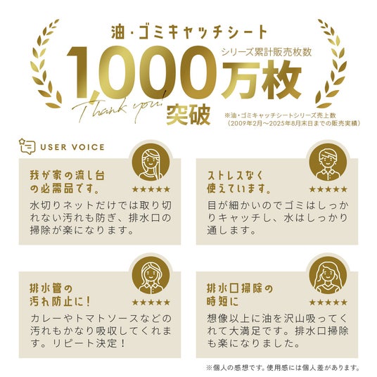 本商品は、従来の網目状ネットでは通り抜けてしまう細かいゴミや、排水管のニオイや詰まりの原因となる油をキャッチしてくれるシートです。シート1枚で約40g(大判サイズは約55g)の油を吸収。(※自社試験により確認。※使用状況により異なります。)排水トラップや排水管のヌメリを防ぎ、お手入れをラクにします。