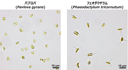 これら微細藻類は、青緑色光を吸収して光合成に用いるカロテノイドの1種フコキサンチンを含有し褐色に見えます(図2)。フコキサンチンは抗酸化作用と脂質代謝調節作用をあわせ持ち、内臓脂肪低減や生活習慣病予防に貢献すると考えられています。医薬・化粧品用途などでの応用も期待されており、今後の生産技術の確立に向けた有用な成果といえます。