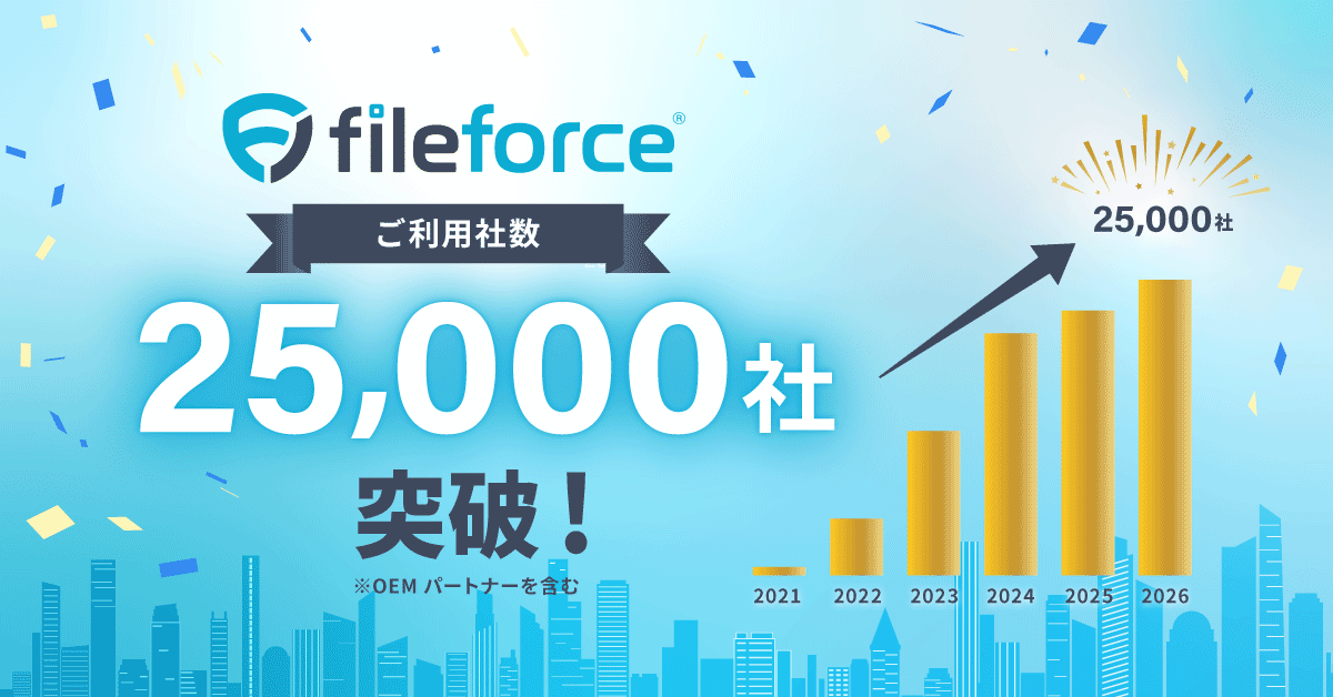 Fileforceは、こうした時代の要求にこたえるIT基盤となるべく、誰もが使いやすい機能と高度なセキュリティ、日本企業のガバナンスに寄り添うクラウドファイルサーバーを提供しており、その価値を多くのお客様にご評価いただいた結果、この度OEMサービスを含むご利用社数が25,000社を突破いたしました。