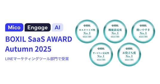 株式会社Mico(本社:大阪市北区、代表取締役:山田 修、以下、当社)が提供する、LINEマーケティングプラットフォーム「Mico Engage AI(ミコ エンゲージ AI)」は、スマートキャンプ株式会社(以下「スマートキャンプ」)が今最も評価されているSaaS(※1)を表彰する「BOXIL SaaS AWARD Autumn 2025」(※2) LINEマーケティングツール部門の「Good Service」(※3)を受賞したことをお知らせいたします。