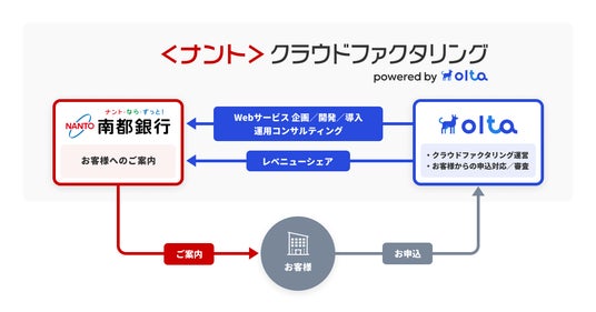 OLTAと南都銀行とのクラウドファクタリング事業における提携では、OLTAがWebサービスの企画・開発・導入および運用におけるコンサルティングを南都銀行に提供し、南都銀行は法人・個人事業主のお客様にサービスをご案内します。