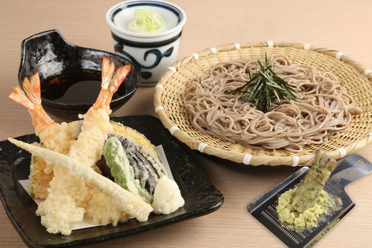 揚げたての大海老天ぷらと茹でたてのざるそばを一緒に味わえる贅沢な一品。