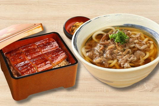 ふっくらと柔らかく焼き上げた鰻に、香ばしさと旨みを引き立てる甘だれをまとわせた「うな重」黒毛和牛を使用した「牛肉うどん」