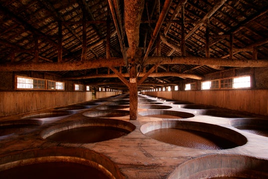 マルキンではこれらの杉の木桶を用い、「天然醸造」という伝統的な製法による醤油造りを守り続けています。長さ95mの木造平屋建ての天然醸造蔵に収められた木桶はもちろん、柱や梁にも微生物が棲みつきます。