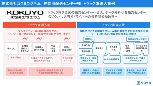 ハコベル株式会社(本社:東京都中央区、代表取締役社長CEO:狭間 健志、以下:ハコベル)は、株式会社コクヨロジテム(本社:大阪市東成区、代表取締役社長:松浦 鉄男、以下:コクヨロジテム)神奈川配送センターにおける「トラック簿」の導入事例記事を公開しました。