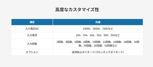 GBPでは1500Vの電圧のみならず、お客様の発電所規模や設計に応じて入力電圧(1500V、1000V、750V)入力回路数(2回路~32回路)、入力電流(10A~35A)、オプション(逆流防止ダイオード)を柔軟に選択いただけます。