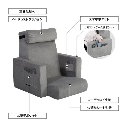 両サイドに、堕落ゲーム時間を快適にする複数のポケットを搭載。スマホから携帯ゲーム機、リモコンにお菓子まで、あらゆるアイテムを座ったまま手が届く範囲に装備しておくことが可能です。