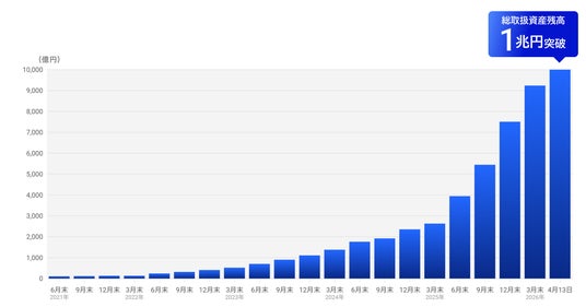 当社グループは、「ROBOPRO(R)」、「4RAP」を活用した投資一任運用サービスおよびAI予測を活用した投資助言など、多様な金融ソリューションの提供を通じて、様々なお客さまのニーズに対応してきました。この度、総取扱資産残高が1兆円を突破したことは、これまでの取り組みが着実に広がりを見せている結果と受け止めています。当社グループの総取扱資産残高については、2025年3月末時点の約2,632億円から、1年間で約6,604億円増加し、約3.5倍の規模となりました。