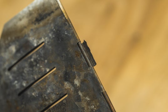 【修理前】熱と荷重で蝶番が歪み、開閉が困難になった状態。