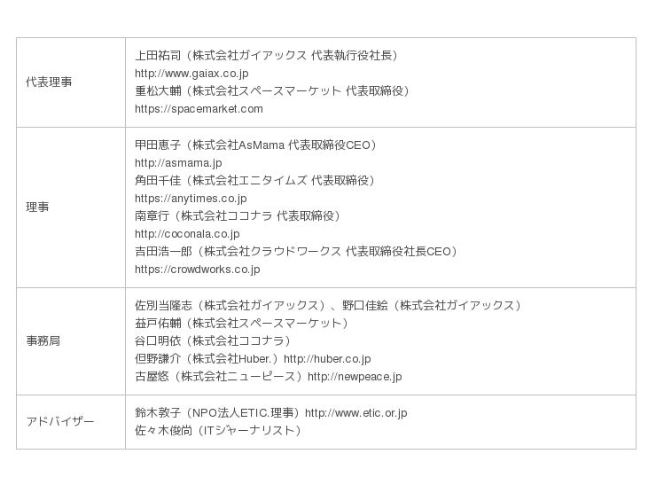 シェアリングエコノミー協会は、地域体験シェアの株式会社ガイアックスとスペースシェアの株式会社スペースマーケットが代表理事を務め、子育てシェアの株式会社AsMama、ご近所サポートシェアの株式会社エニタイムズ、知識スキルシェアの株式会社ココナラ、スキルシェアの株式会社クラウドワークスが理事として参画し、シェアリングエコノミーが日本経済の発展を支える仕組み・概念の一つになることを目指して活動を進めてまいります。