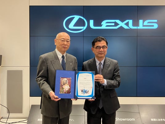 さらに、2026年2月4日(水)には、レクサス山下公園ショールーム(横浜市中区)にて贈呈式が執り行われました。当法人からは理事の西村亮平、トレーナーの平沢佳奈、候補犬のエイミーが出席し、ウエインズトヨタ神奈川株式会社 代表取締役会長 宮原郁生様より、ご寄付を受け取りました。
