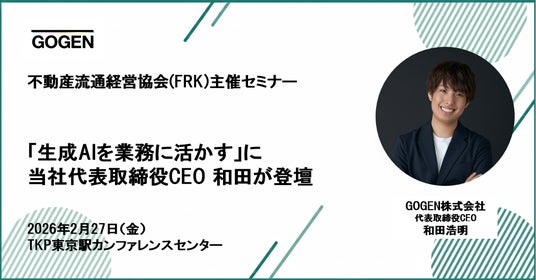 不動産売買支援ハブ「レリーズプラットフォーム」の開発・提供をするGOGEN株式会社(本社:東京都港区)の代表取締役CEO 和田 浩明が、2026年2月27日(金)に一般社団法人不動産流通経営協会(以下、FRK)が主催するセミナー「生成AIを業務に活かす」に登壇することをお知らせいたします。