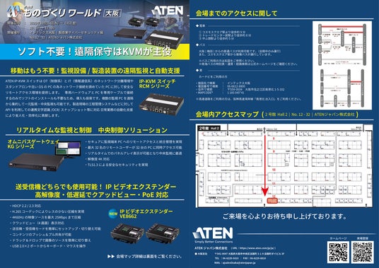 本展示会では「ソフト不要! 遠隔保守はKVMが主役。」をテーマに、製造業をはじめ幅広い分野の皆さまに向けて、セキュアに実現できるリモート監視・中央監視ソリューションをはじめ、最新のIP-KVMやビデオエクステンダーなど多彩な製品を実機展示いたします。さらに、現場課題を解決する具体的な事例やデモンストレーションもご体験いただけます。