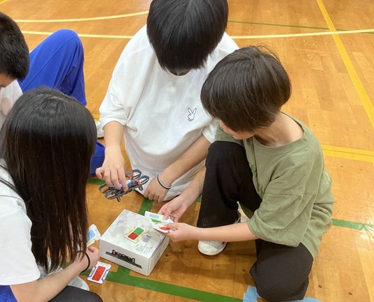 授業では、まず「プログラミングとは何か」「プログラミングとドローン関係性」といった基礎知識を座学形式で学んだ後、実際にプログラミングカードを用いてドローンを飛ばす実践演習を行いました。