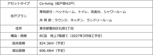 今回組成したファンドでは、Co-livingの開発を行います。Co-livingは、シェアハウスとコワーキングスペースの機能をあわせもつ職住一体の施設で、多様な価値観・職種の居住者どうしが交流するコミュニティとして人気が高まりつつあります。本物件においては、プライベート空間である専有部はシンプルでやや小さめな居住スペースとする一方で充実した共用部を整備、間口の広いキッチンやランドリールームに加え、居住者どうしのコミュニティスペースとなるラウンジを備えるプランとなっております。Co-livingは20~30代の単身者を主要な想定ターゲットとしており、在宅ワークやフリーランスといった働き方とも親和性が高く、共用施設を有効に利用しながら充実したライフスタイルを実現することができるとして注目を集めています。こうしたCo-livingをめぐっては、大手不動産ディベロッパーが相次いで開発を進めるなど、活発な市場動向がうかがえます。