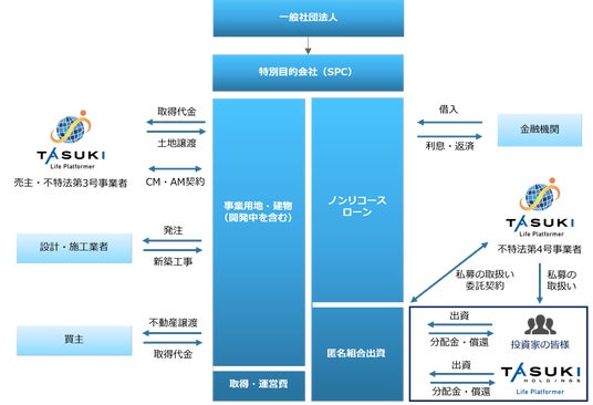 タスキはこれまで、不動産特定共同事業法に基づく不動産クラウドファンディング「TASUKI FUNDS」および、オフバランス型の私募ファンド「TASUKI PRIME FUNDS」の組成・運営を通じて、不動産と金融を融合した不動産金融商品を提供してまいりました。「TASUKI PRIME FUNDS」においては、完成済みの商業ビルを取得し、アセットマネジャーとして運用を行うファンドや、新築レジデンスの不動産信託受益権をSPC(Special Purpose Company/特別目的会社)が取得・運営するスキーム等でのファンド組成実績があり、投資家の多様なニーズに応える不動産ファンドのラインアップを拡充しております。
