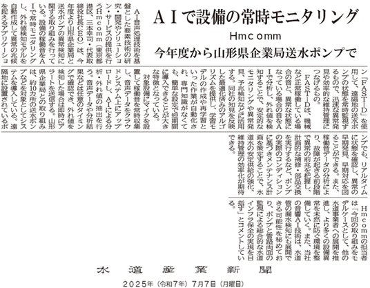 異音検知によるインフラメンテナンスDXのリーディングカンパニーであるHmcomm株式会社(本社:東京都港区、代表取締役社長CEO:三本 幸司)は、音×AIによる異常音検知技術を強みとし、社会インフラの維持・保全に貢献するソリューションを提供しています。特に水道管の老朽化という社会課題に対し、今年度より山形県企業局と送水ポンプの異常検知に関する取り組みを行っており、当該取り組みが新聞社に取材され、記事として掲載されました。